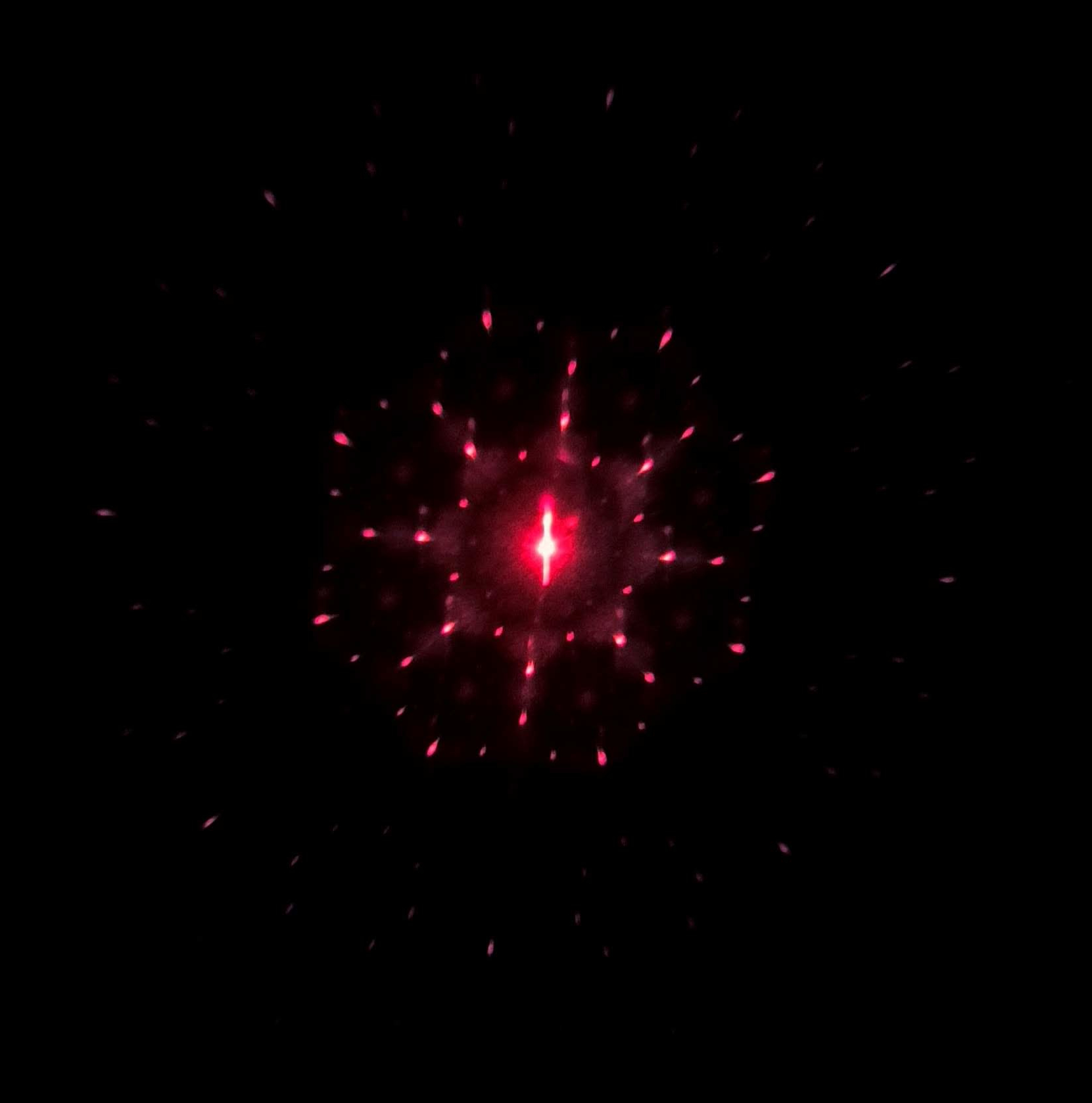 *The images on this page are photos of diffraction patterns of the Penrose tiling (left), an 8-fold symmetric random tiling (center), and the powder diffraction of the square lattice (right), generated via a laser diffractometer. All photos taken by N. Manibo.
