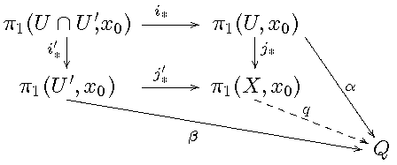 Beweis von 3.: Seien Gruppen-Homomorphismen α: π1(U,x0) → Q und β: π1(U',x0) → Q mit αi* = βi'* gegeben. Diese Bedingung besagt also: Ist ω eine Schleife in X, deren Bild im Durchschnitt von U und U' liegt, so ist α([ω]U) = β([ω]U'). (Dabei haben wir den jeweiligen Index hinzugefügt, um zu betonen, dass die Bildung der Homotopieklasse einmal in U und einmal in U' erfolgt.)